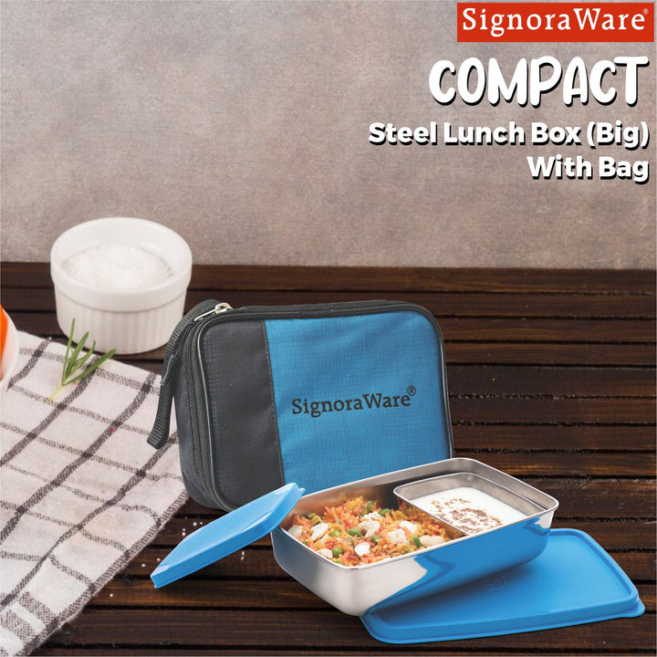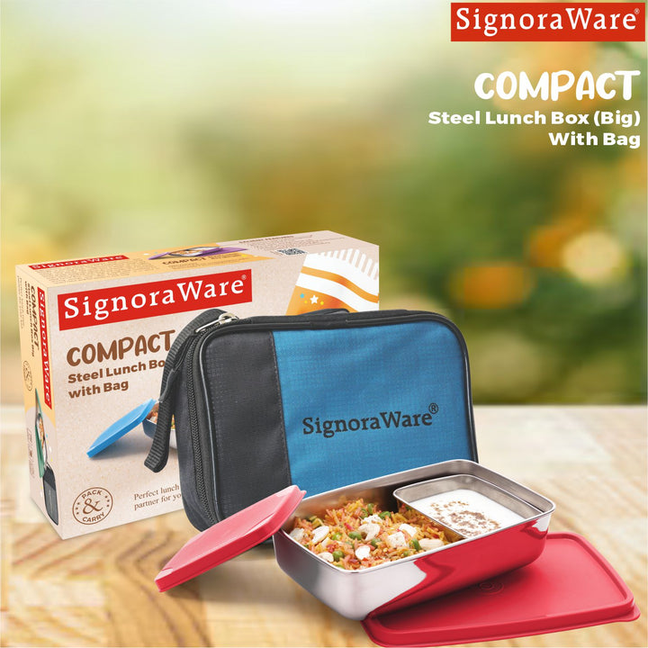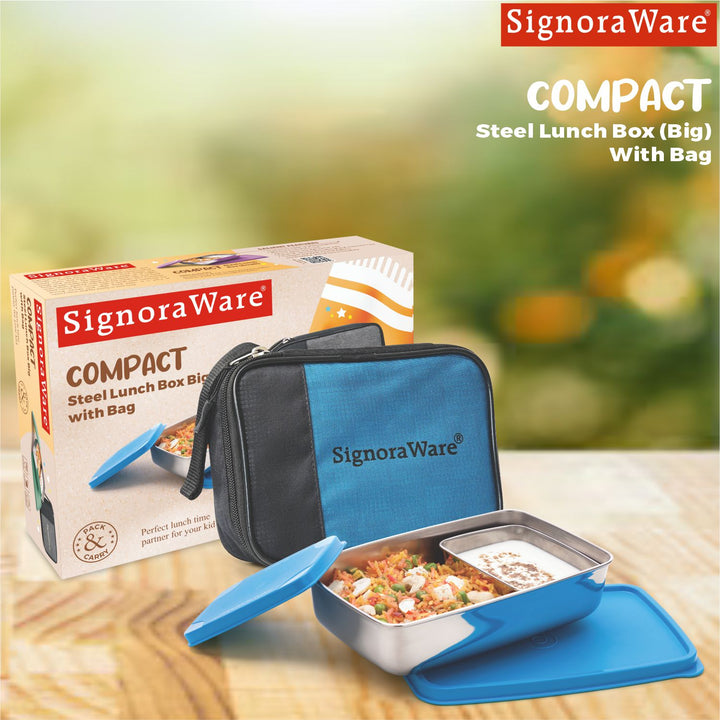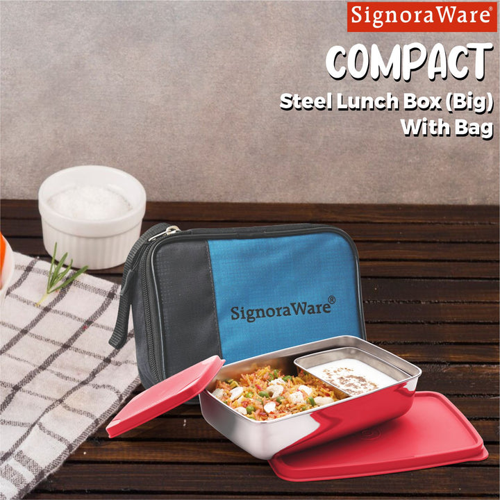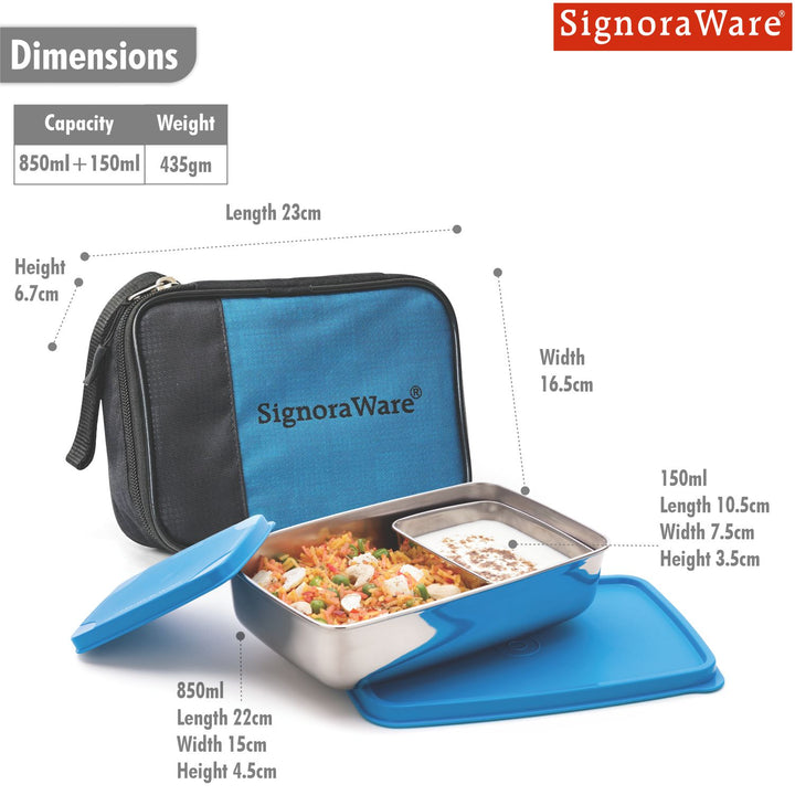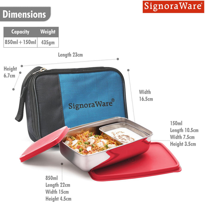 - KEY FEATURES – Quantity Storage of Lunch Tiffin Box 150ml L x H x W 10x3.5x7.3 Centimeters + 850ml L x H x W 21.5x5x15 Centimeters | Dimensions of Bag L x H x W 23x6x16 Centimeters | Material – Food Grade BPA Free Plastic |Containers of Stainless Steel – Yes | Airtight – Yes | Pack Contains – Set of 1 Steel Lunch Box.