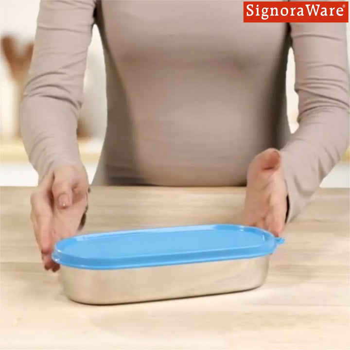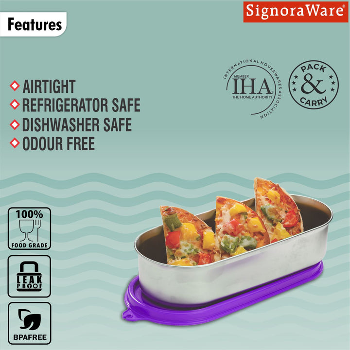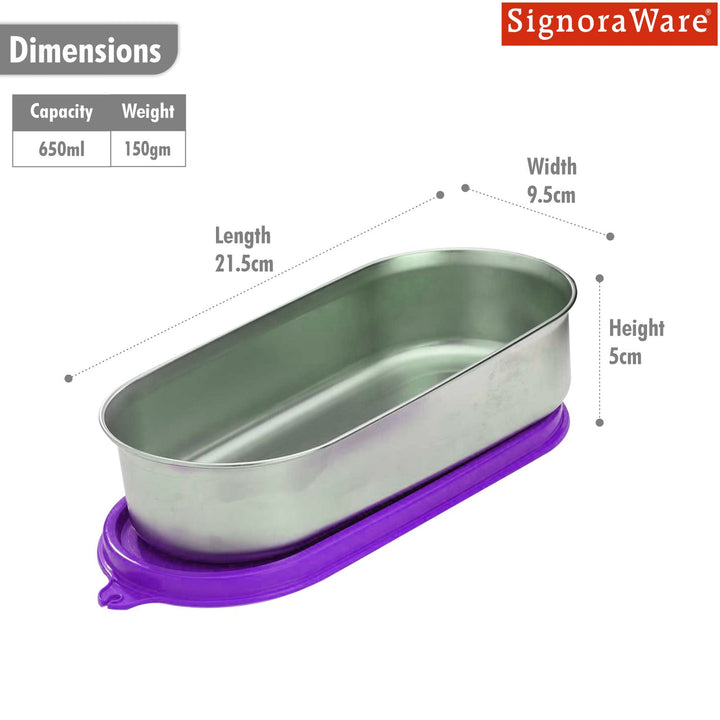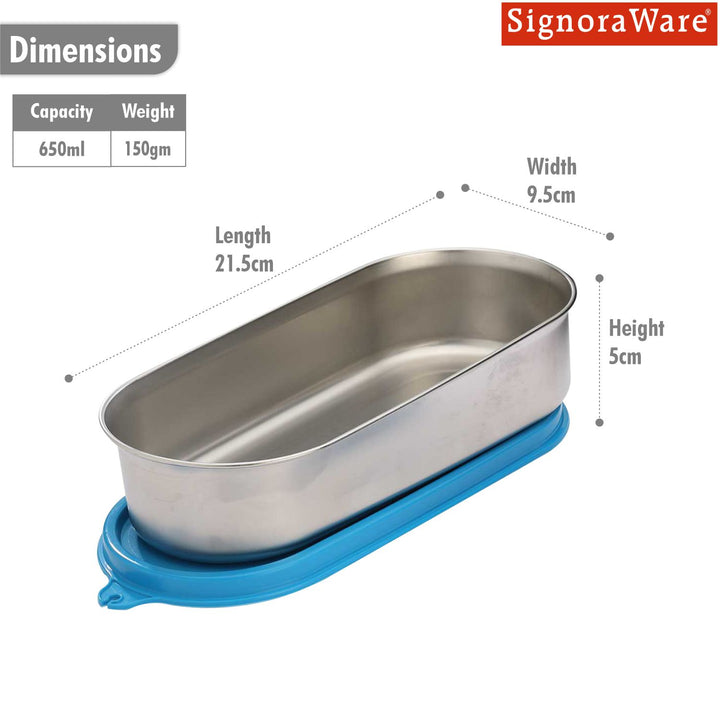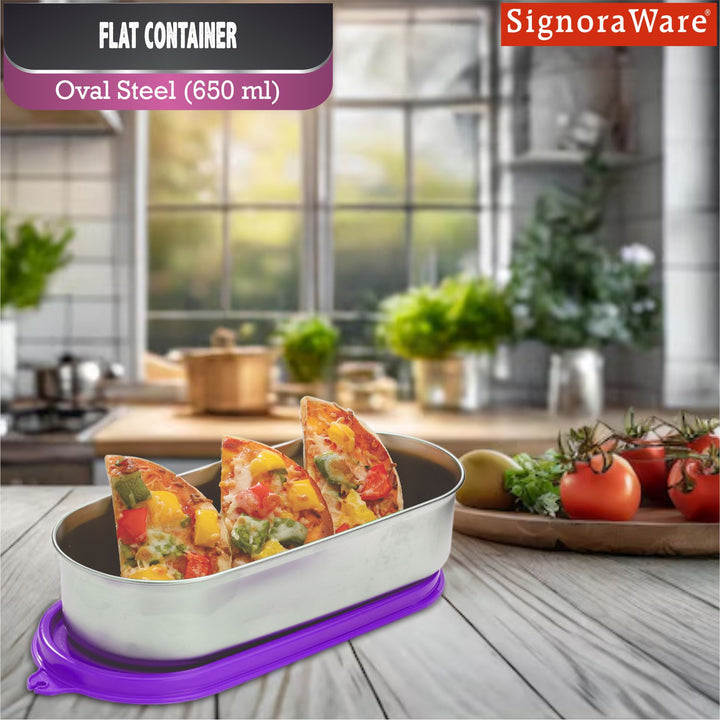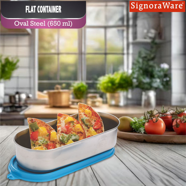 - KEY FEATURES : Quantity Storage – 650ml | Stainless Steel Container – Yes | Food Grade BPA Free – Yes | Airtight and Leak Proof Lid – Yes | Freezer and Dishwasher Safe Box – Yes | Stackable – Yes | Package Contains – Set of 1 Flat Oval Stainless Steel Container with leak-proof seal.