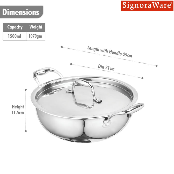 - Size: Kadhai with lid (18 cm, 1.5 liters) ; Item shape: Circle ; Colour : Silver.