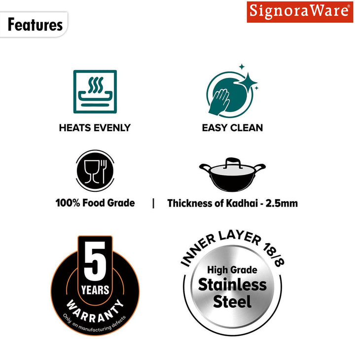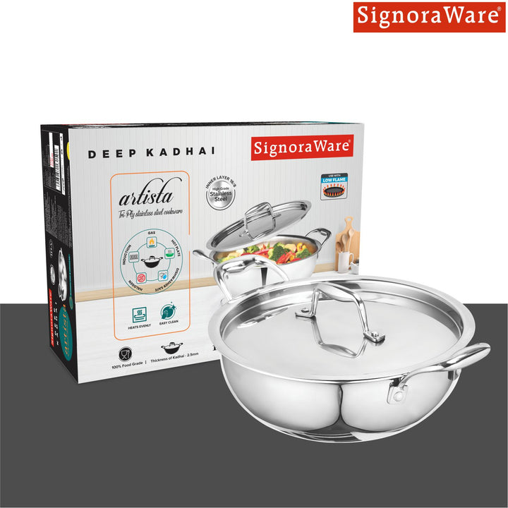 - TRIPLY Construction: Signoraware Artista (Steel-Aluminum-Steel - 3 Layers) throughout the Cookware. Inner Layer of this Cookware is Made from 304 Quality Food Grade Stainless Steel. It can withstand corrosion from most oxidizing acids. That durability makes 304 easy to wash, and therefore ideal for kitchen and food applications. Middle Layer is Made of thick gauge aluminum which is highly heat conductive thus maximizes the even spreading of heat, minimizes sticking and gives tastier, more evenly cooked food with less stirring. Outer surface is made of magnetic 430 Quality stainless steel which supports Induction Cooktop, Electric Cooking System, Gas Stove, Halogen etc. This Smart Cookware has thickness of 2.5mm.