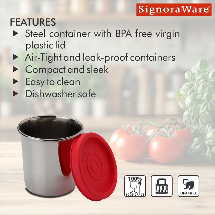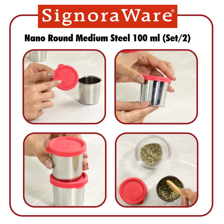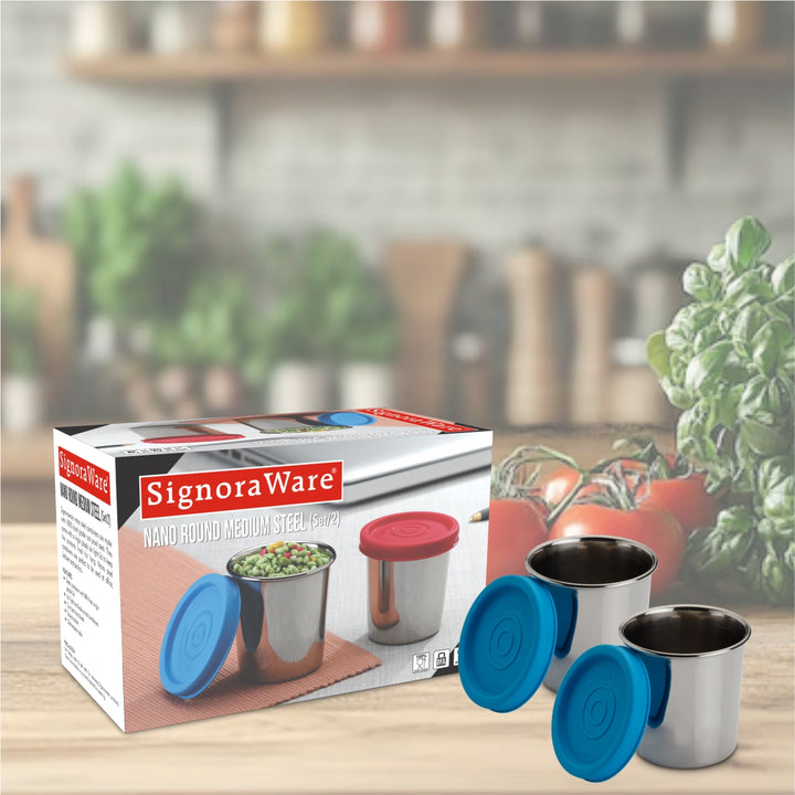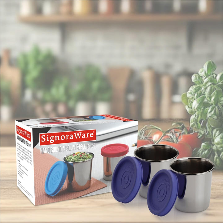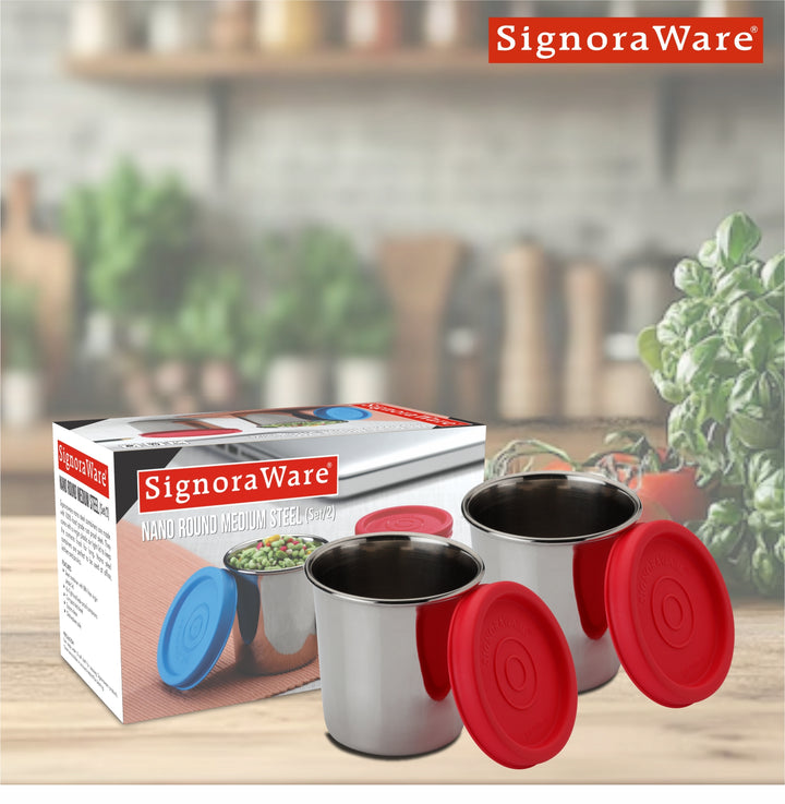 - Other Details: The Signoraware Nano Round Medium Steel Containers are a practical and convenient solution for small-item storage. Their durable construction, compact size, and airtight seal make them a great choice for everyday use. This set of two containers ensures you have ample storage options for your various needs.