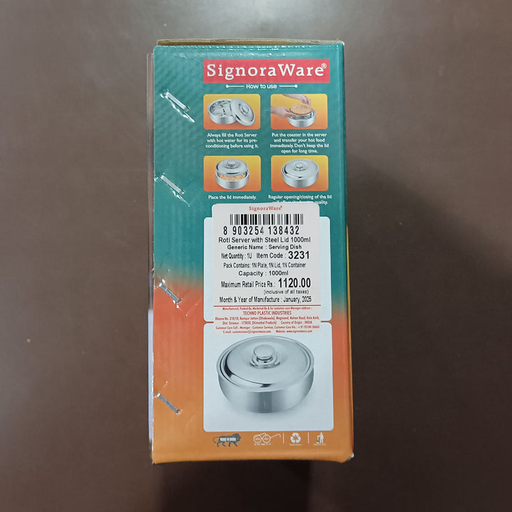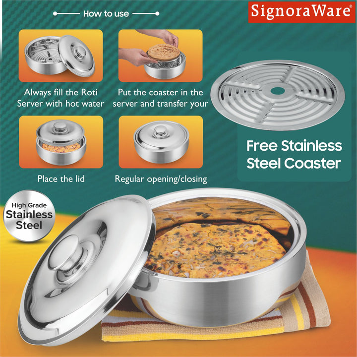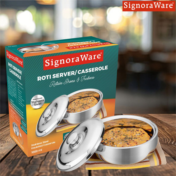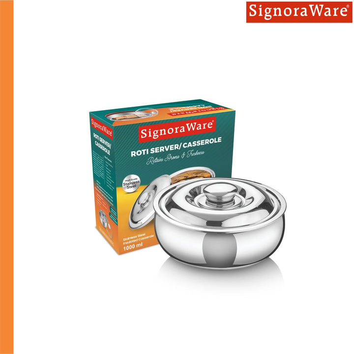 - SIGNORAWARE’S ROTI SERVER/CASSEROLE is a perfect everyday household product that helps in keeping your food fresh for a long time. It also comes with a steel lid that enhances the overall look and feel of the casserole. Serve hot and fresh rotis with relish. With double Wall Insulated containers, these casseroles help you keep your rotis warm and ready to serve. Can be used to store and serve hot dishes, dal and curries too.