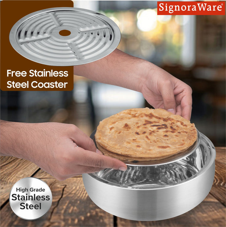- STAINLESS STEEL COASTER : Signoraware’s Roti Server comes with a free stainless steel coaster. It creates a gap at the bottom which prevents the rotis from sticking to the surface and turning soggy thus keeps your rotis fresh for longer duration.
