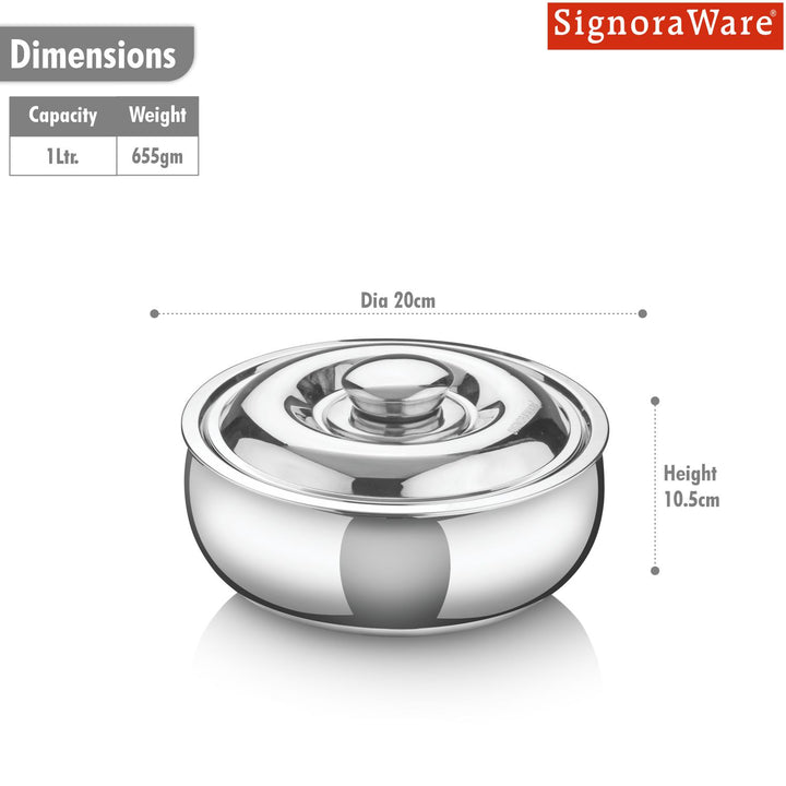 - SERVE HOT & FRESH : Ideal for daily food servings, especially for fresh and hot rotis. Sleek look and mirror finish body adds beauty to your kitchen. Serve piping hot idlis, puris, parathas, curries, pasta and much more with Signoraware’s Roti Server/Casserole. For best results season it with warm water before pouring any curry.