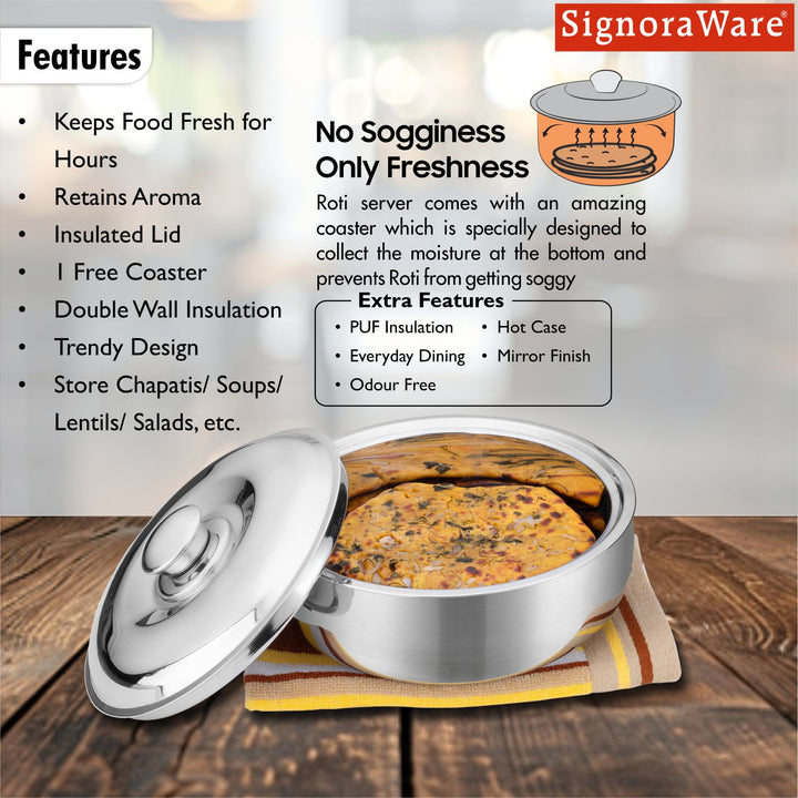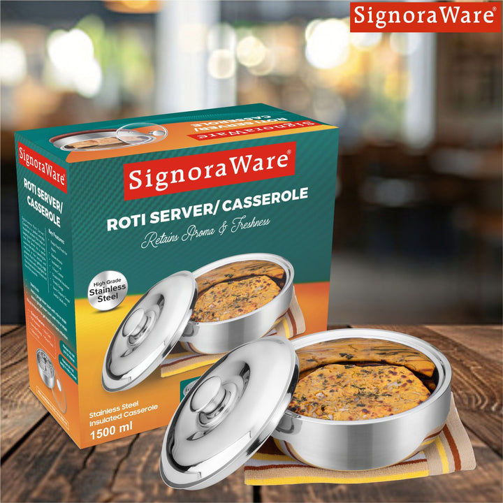 - SIGNORAWARE’S ROTI SERVER/CASSEROLE is a perfect everyday household product that helps in keeping your food fresh for a long time. It also comes with a steel lid that enhances the overall look and feel of the casserole. Serve hot and fresh rotis with relish. With double Wall Insulated containers, these casseroles help you keep your rotis warm and ready to serve. Can be used to store and serve hot dishes, dal and curries too.