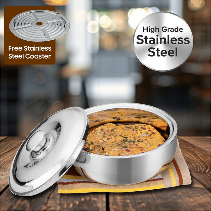 - INSULATED STAINLESS STEEL LID : The dome shape of the lid facilitates the condensed water to trickle down on the walls of the casserole instead of dripping onto the rotis. This also prevents them from turning soggy. The stainless steel Lid is also insulated therefore it acts as an additional measure to trap the heat and freshness inside.
