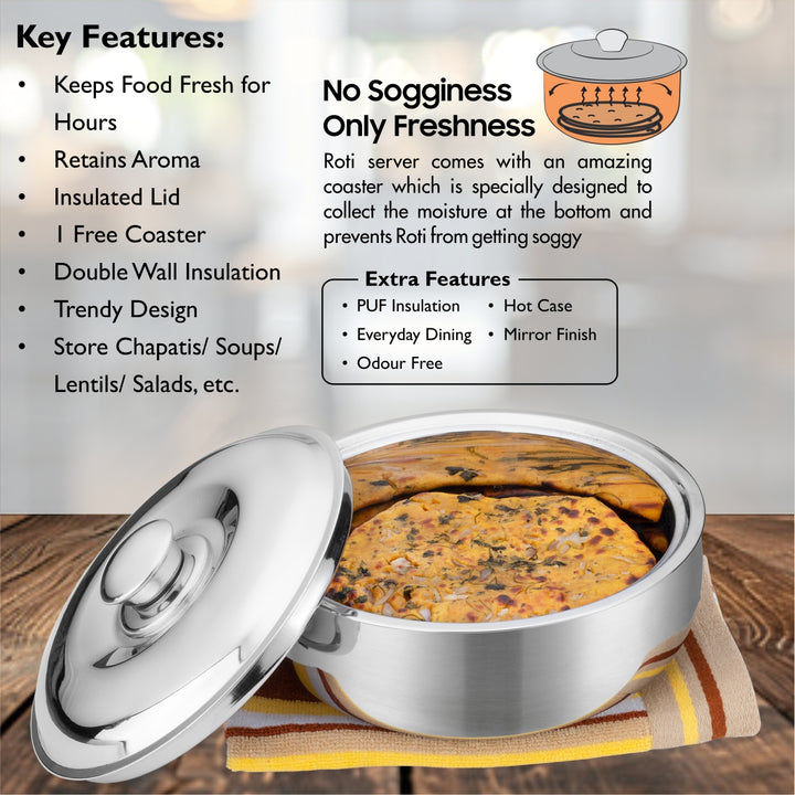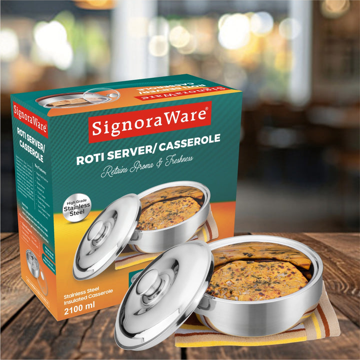 - SIGNORAWARE’S ROTI SERVER/CASSEROLE is a perfect everyday household product that helps in keeping your food fresh for a long time. It also comes with a steel lid that enhances the overall look and feel of the casserole. Serve hot and fresh rotis with relish. With double Wall Insulated containers, these casseroles help you keep your rotis warm and ready to serve. Can be used to store and serve hot dishes, dal and curries too.