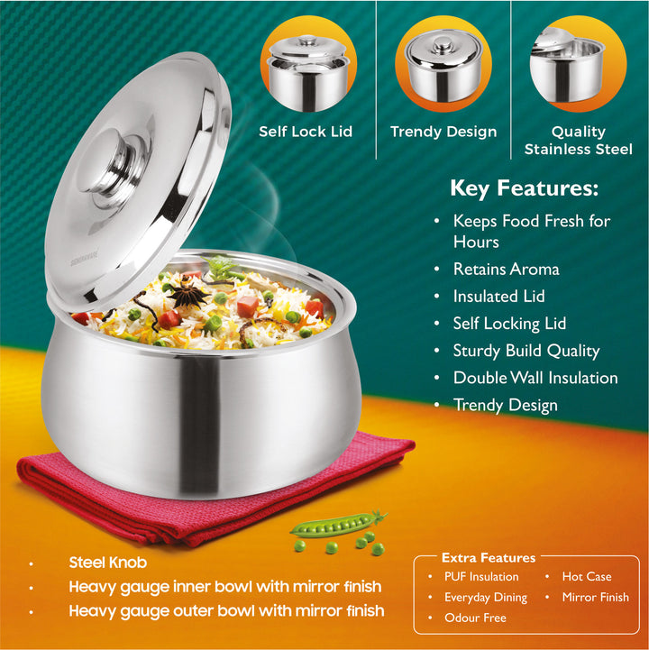 - PRESERVING HYGIENE : Rust free stainless steel is hygienic and safe to store food. The double wall insulation also keeps the food warm longer. Preserving food the right way is really important so as to consume fresh and hygienic food. The nutrients of your food will never be lost as Hot Delight Casserole come to be your ideal choice. The insulated steel lid ensures a snug fit to seal in the heat and provide leakage-free storage. Hence, Seal it tight to preserve it right !