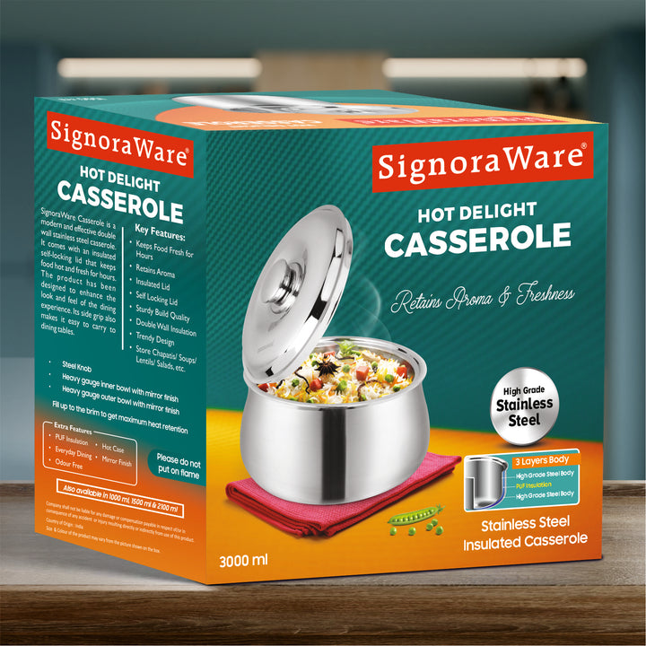 - SIGNORAWARE HOT DELIGHT CASSEROLE : Hot Delight Casserole is designed to give you a refreshing dining experience. Its double-walled Insulation system allows maximum temperature retention. This product is durable, sleek and built to last a lifetime and the stainless steel body gives it a timeless look. Its high quality stainless steel body keeps it rust free and Corrosion free thus making it long lasting. The product has been designed to enhance the look and feel of the dining experience.